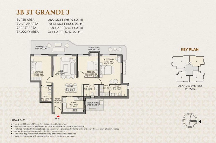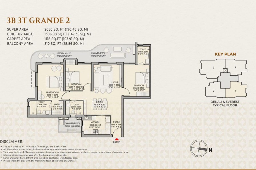 3 BHK + Servant: 2000 - 2050 - 2100 sq.ft